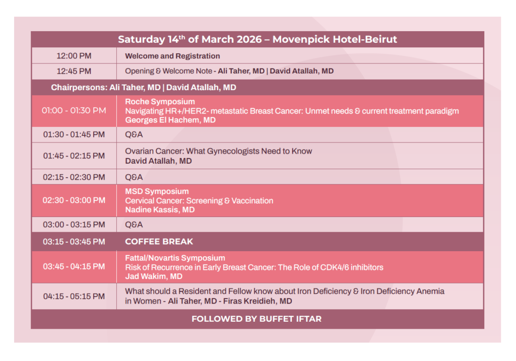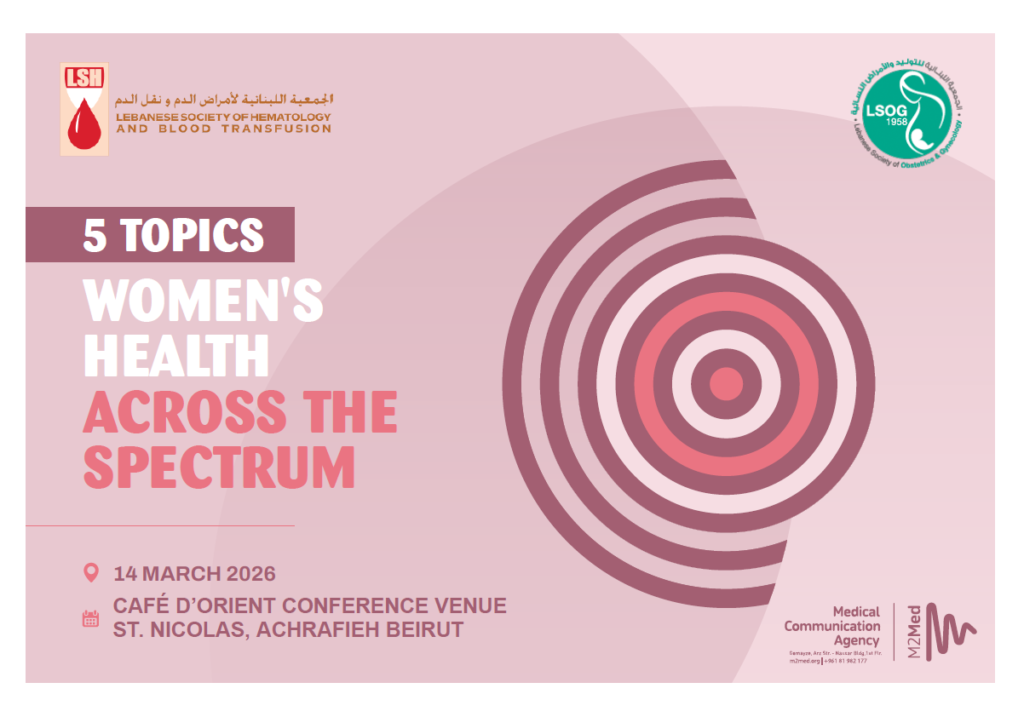 On behalf of Dr. Ali Taher – President of The Lebanese Society of Hematology & Blood Transfusion (LSHBT) and Dr. David Atallah -President of The Lebanese Society of Obstetrics & Gynecology (LSOG) , it is our pleasure to announce the “5 Topics Women’s Health – Across The Spectrum“ congress which will take place on Saturday 14th of March 2026 at Café D’Orient Conference Venue, St. Nicolas, Achrafieh – Beirut.