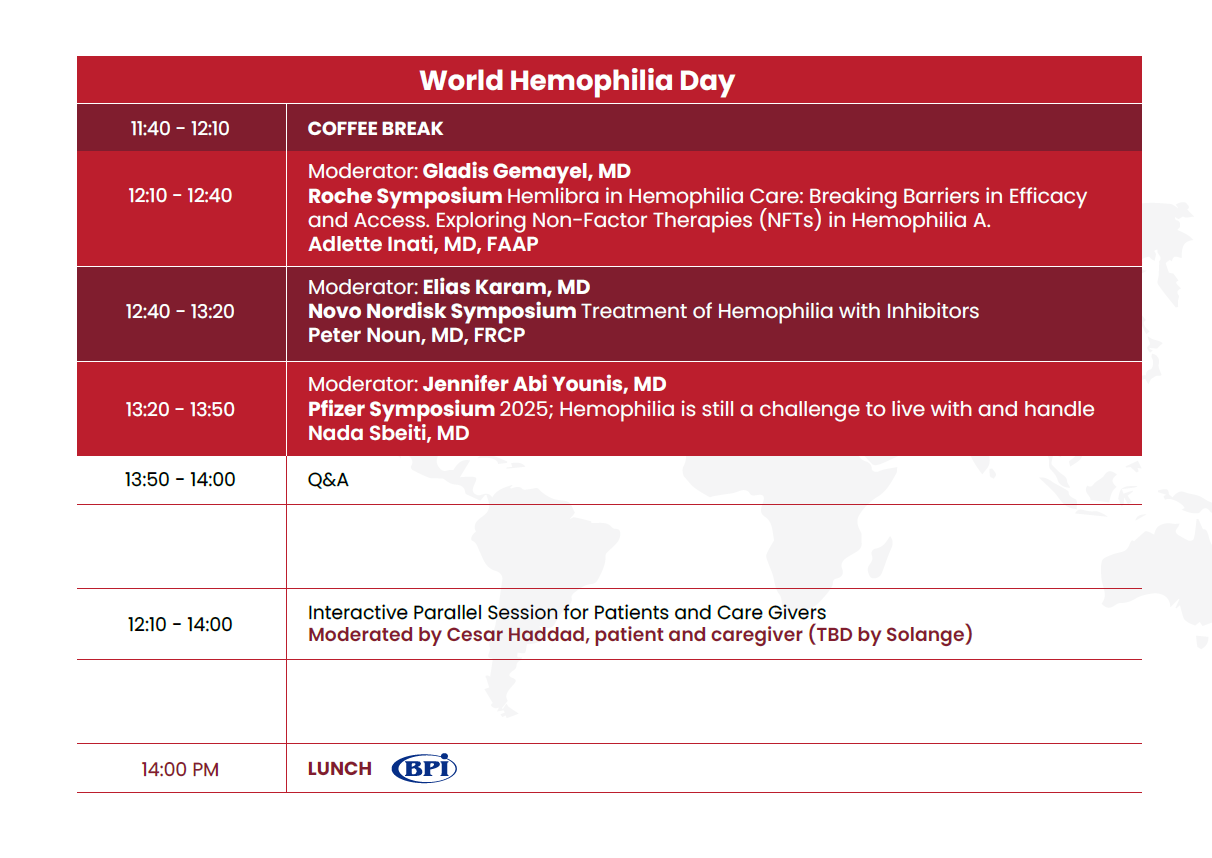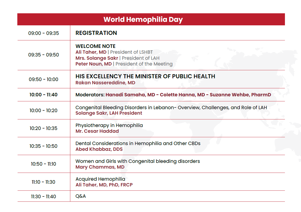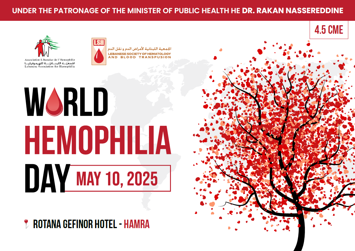 The Lebanese society of Hematology and in collaboration with the Lebanese Association for Hemophilia have decided to host a meeting entitled World Hemophilia Day on Saturday, May 10, 2025 at Rotana Gefinor Hotel – Hamra.