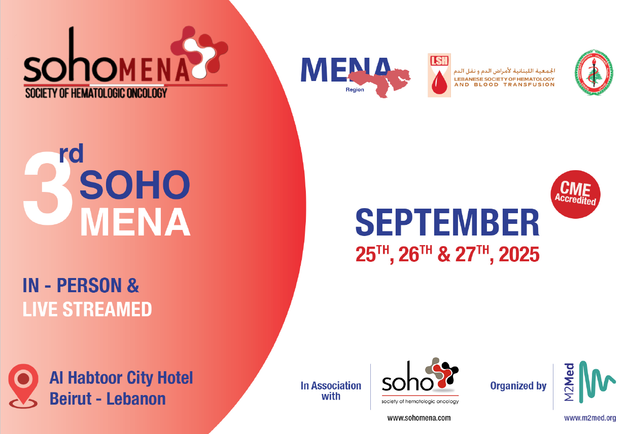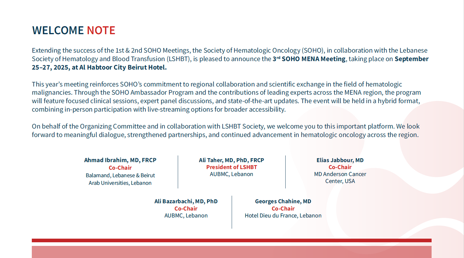 Following the consecutive success of the 1st and 2nd SOHO MENA meetings and On behalf of the Third SOHO MENA 2025 Organizing Committee, Dr. Ali Bazarbachi, Dr. Georges Chahine, Dr. Ahmad Ibrahim in collaboration with The Lebanese Society of Hematology & Blood Transfusion (LSHBT), its president Dr. Ali Taher, it is our pleasure to announce the 3rd SOHO MENA which will take place on September 25th, 26th, and 27th, 2025 at Al Habtoor City Beirut Hotel.